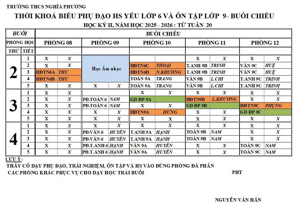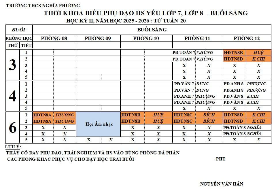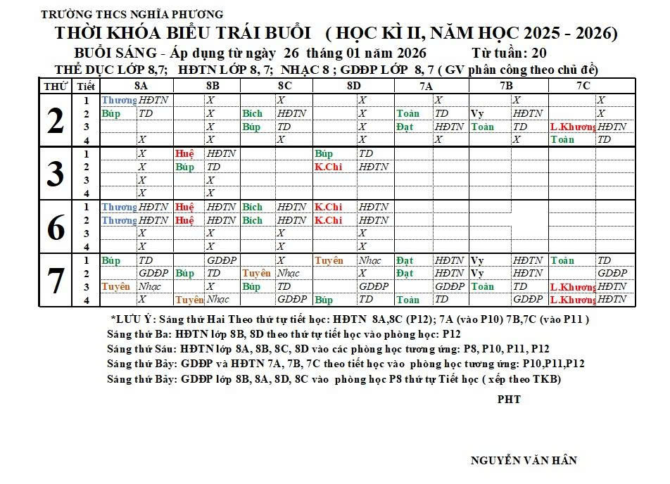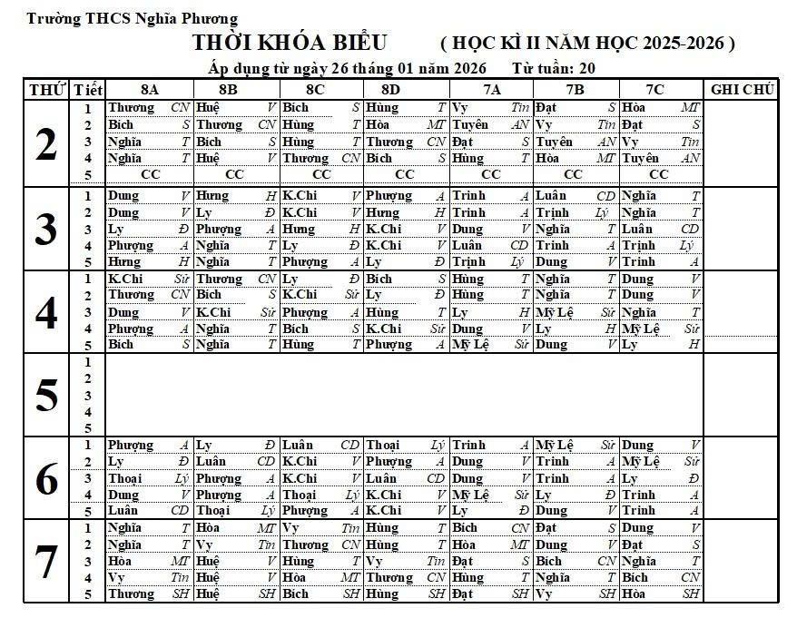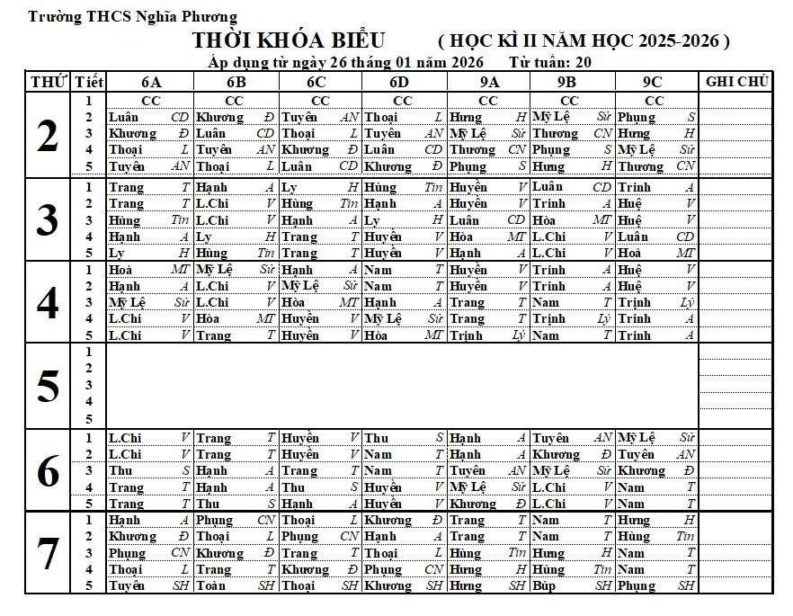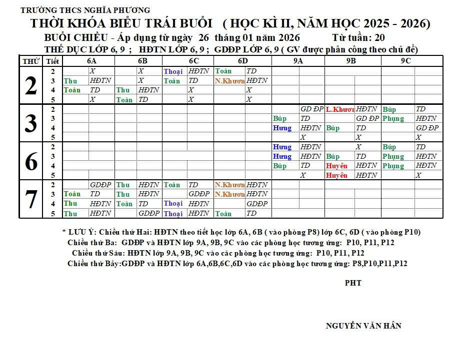 THỜI KHOÁ BIỂU HỌC KỲ 2 (2025-2026)